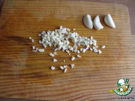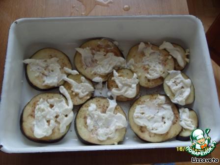 Глубокую прямоугольную форму смазываем маслом и начинаем укладывать офощи. 1-ый слой - баклажаны (предварительно сполоснутые). Присыпаем солью и хмели-сунели. Затем посыпаем чесноком. У меня уходит приблизительно 2-3 зуб. на слой. Я люблю побольше чеснока, к тому же он только улучшает вкус данного блюда. Поливаем всё майонезом