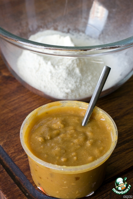 Муку с содой просеять в миску. В отдельной емкости смешать арахисовое масло и мед (сироп).