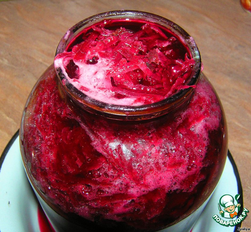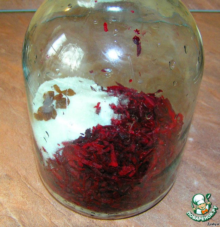 В 3-х литровую банку поместить свеклу, сахар, дрожжи, изюм и залить теплой кипяченой водой.