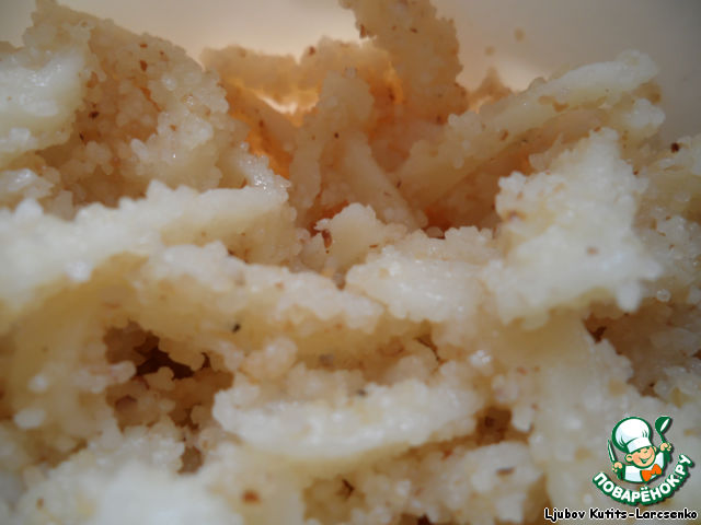 Перемешиваем осторожно. Вот всё, в принципе, можно уже есть. Если оставите в закрытой кастрюльке, то она разбухнет и не будет похрустывать потом. Манка немного напоминает что-то, только не знаю что... и орехи - не орехи, и сухари - не сухари... В общем, необычно и вкусно, на мой взгляд.