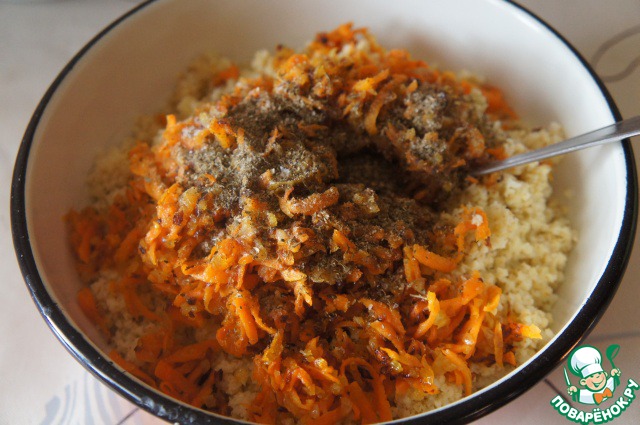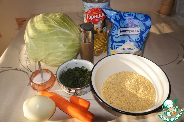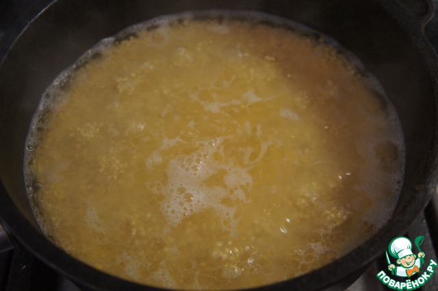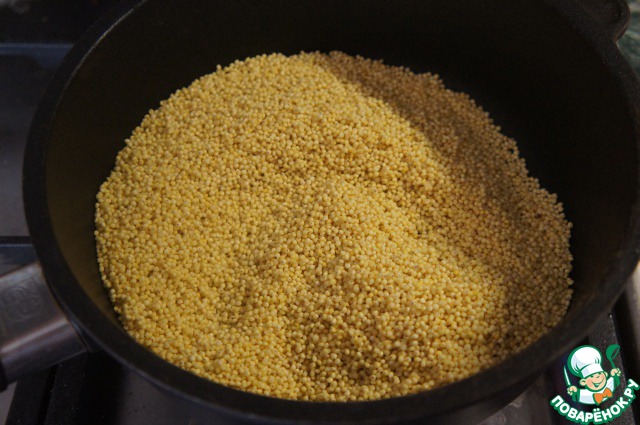 Пшено я использовала фирмы Мистраль, оно очень чистое, одно удовольствие с ним готовить. Пшено тщательно промыть несколько раз до прозрачной воды, затем прокалить на сухой сковороде до сыпучести.