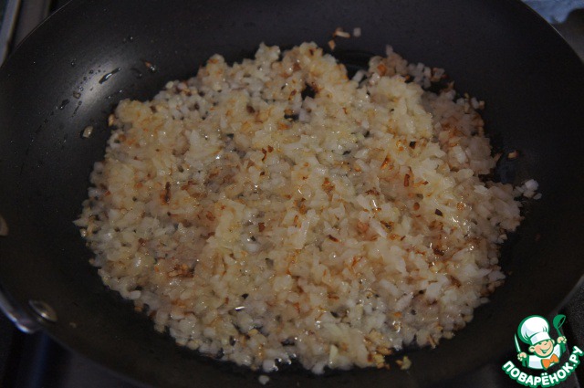На сковороде с растительным маслом спассеровать до румяности мелко нарезанный лук.