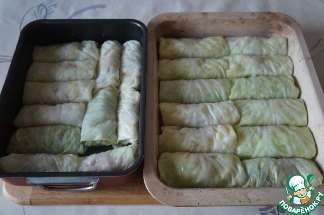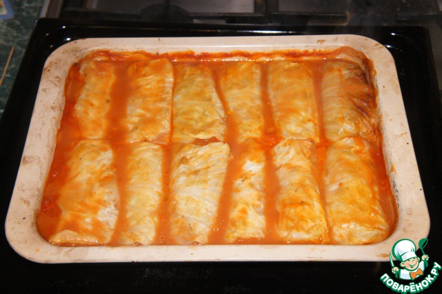 Залить соусом и поставить в горячую духовку. Запекать до готовности, примерно минут 40. В кастрюле голубцы можно просто потушить на небольшом огне на плите.