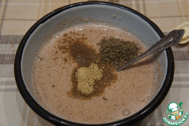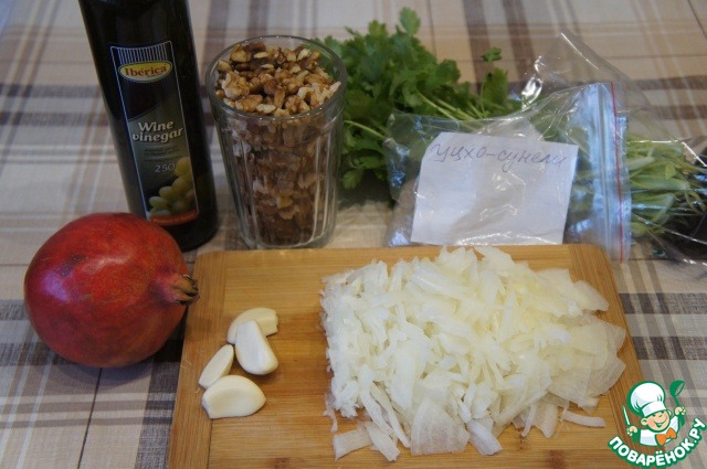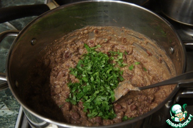 Добавить уцко-сунели, чабер, соль и красный острый перец по вкусу. Я еще добавила молотого кориандра. Развести фасолевым отваром.