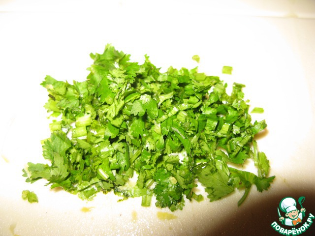 Зелень мелко порубить.