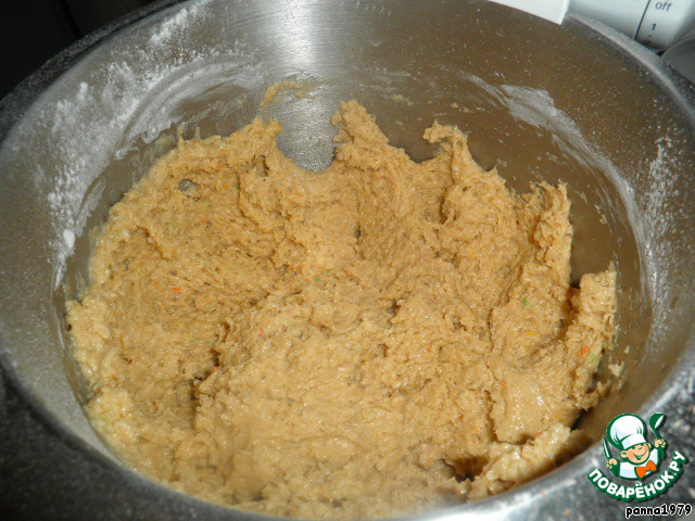 Добавляем в наше тесто просеянную муку и разрыхлитель. Замешиваем некрутое тесто.
