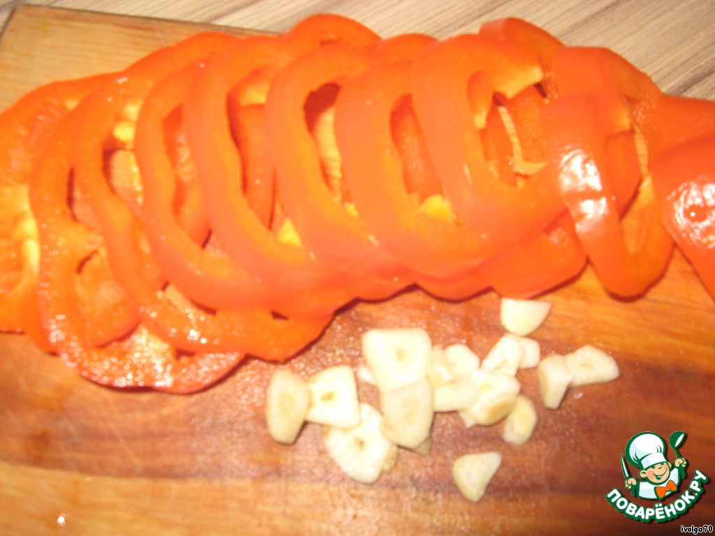 Чеснок измельчаем, а болгарский перец режем кольцами