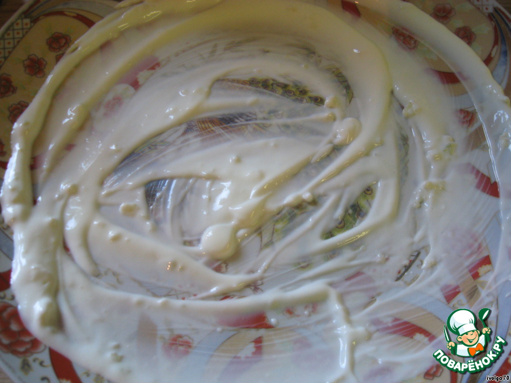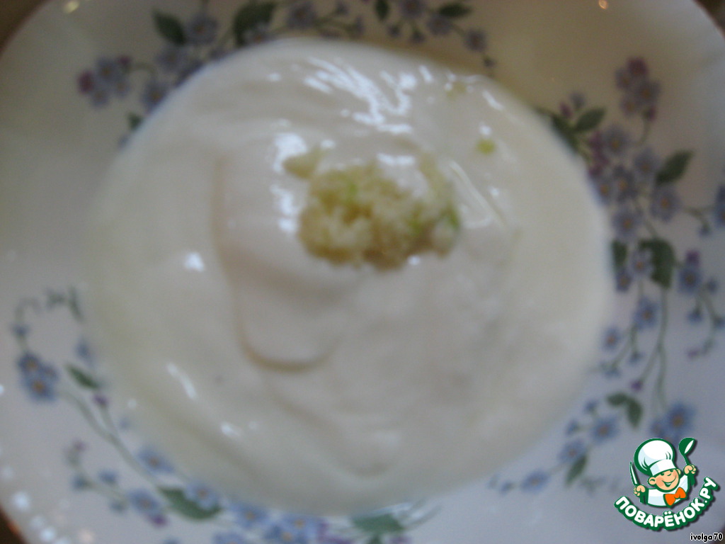 Теперь в сметану или йогурт выдавливаем зубчик чеснока и солим.