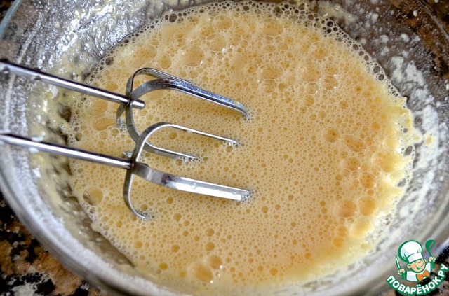 1. Разогреть духовку до 230С. Растопить масло в сковороде. Половину растопленного масла вылить в большую миску, туда же добавить яйца, соль и сахар и взбить. Постепенно, продолжая взбивать, добавить муку, потом молоко и ванильную эссенцию.