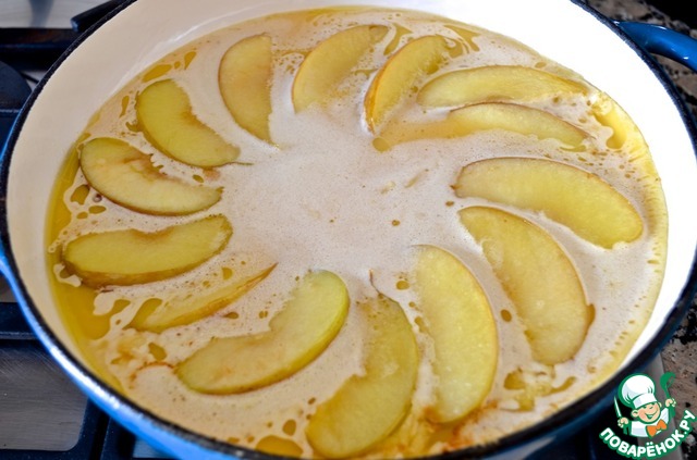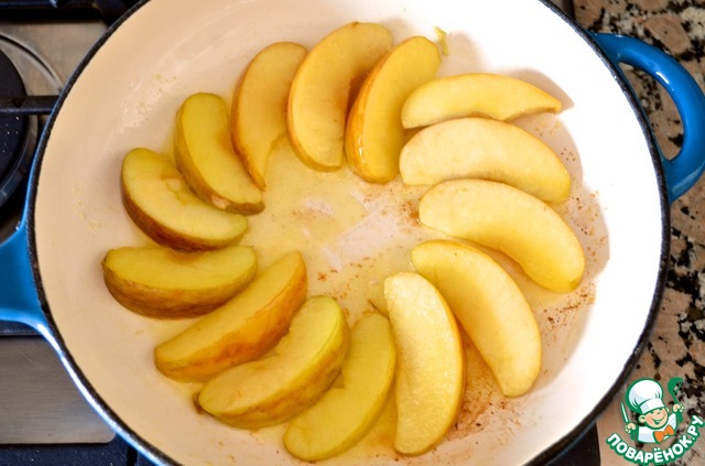 2. Яблоко разрезать на дольки и обжарить в оставшемся в сковороде масле с обеих сторон до мягкости.