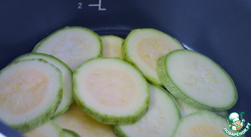 Включить режим Поджаривание. Разогреть масло, положить кабачки и жарить 10 мин.