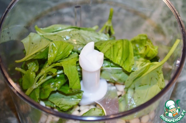Тем временем приготовить соус песто. Измельчить в блендере очищенный чеснок, кедровые орешки и базилик.