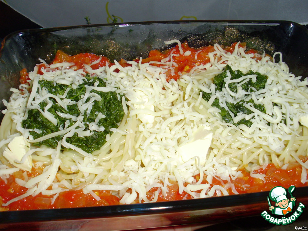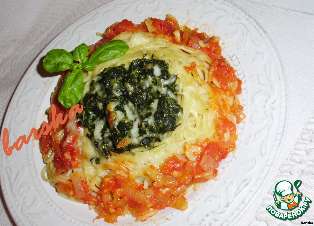Заполнить гнёзда внутри шпинатной массой, а по бокам - выложить томатно-луковый соус.