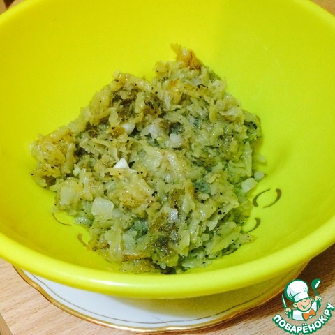 Трем оставшуюся картофелину на крупной терке и добавим к обжаренной массе. Хорошо перемешать. И можно лепить
