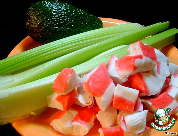 Довольно крупно нарезаем сельдерей и крабовое мясо.