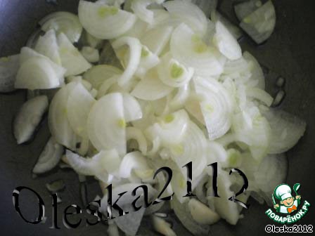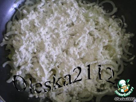 Посыпаем лук мукой. Перемешиваем и обжариваем.