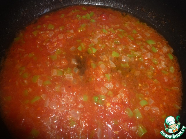Через пару минут добавляем помидоры, томатную пасту, немного воды. Перемешиваем, закрываем крышкой. Тушим минут 10-13.