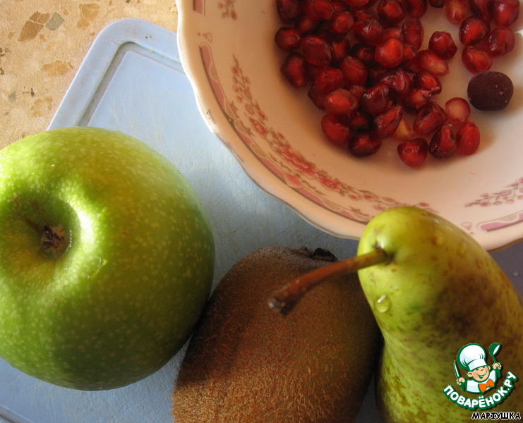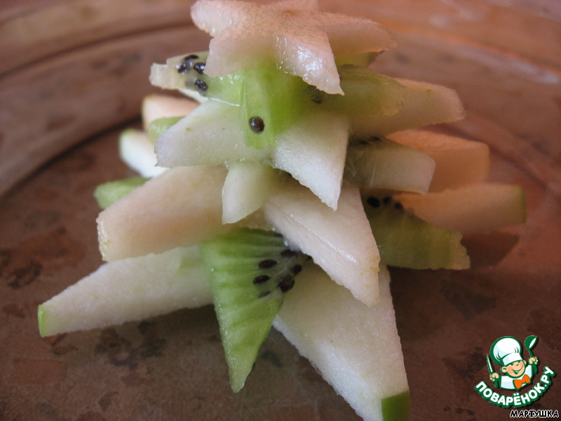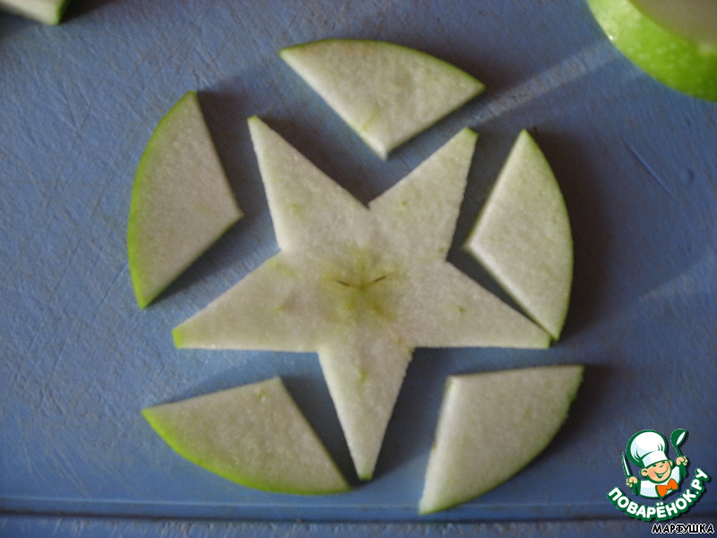Вырезаем две звездочки из яблока, две звездочки из груши и три звездочки из киви.