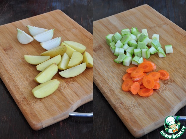 Когда картофель и лук станут золотистого цвета, добавить тонко нарезанную морковь, спустя 3-5 минут добавить нарезанный кубиками кабачок.