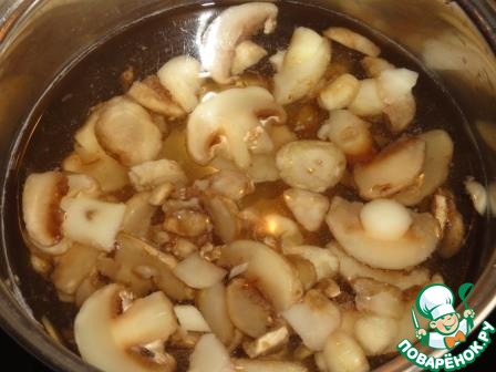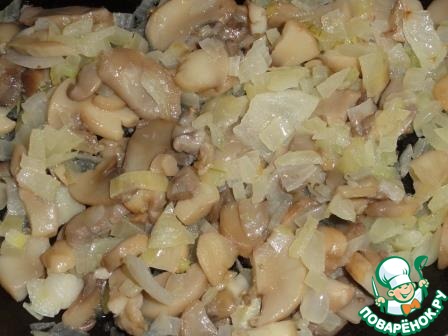 4)Обжариваем мелкорубленый лук до мягкости, добавляем резанные отваренные грибы, обжариваем минут 5.