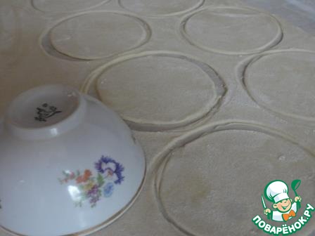 6)Раскатываем тесто толщиной 0,5 см. вырезаем на нём круги пиалой диаметром 11см. Всего должно, получится 16 тюльпинчиков.