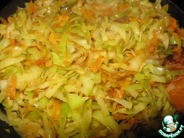 Обжаривать до золотистого цвета капусты, чтобы капуста была слегка жареная, а не тушёная. Добавить бульон и накрыть крышкой, посолить, поперчить.