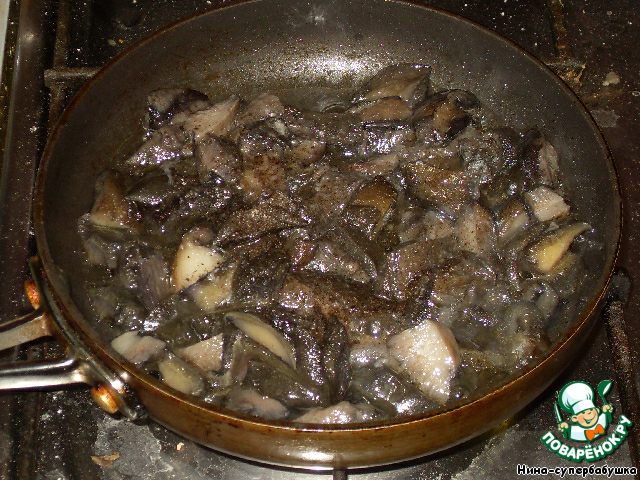 Грибы разморозить, нарезать ломтиками, отжать лишнюю жидкость. Высыпать грибы на разогретую с растительным маслом сковороду и слегка обжарить, пока не выпарится лишняя влага.