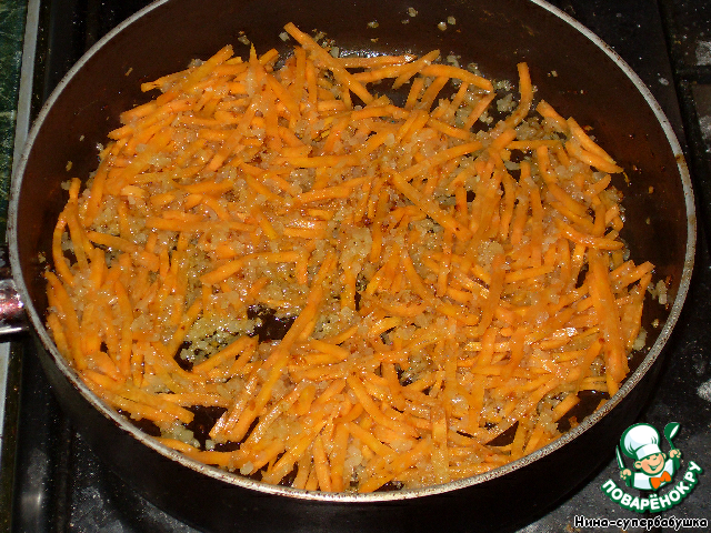 затем добавить морковь и обжаривать на среднем огне минут 5.