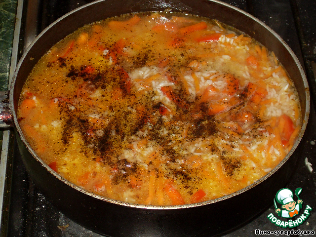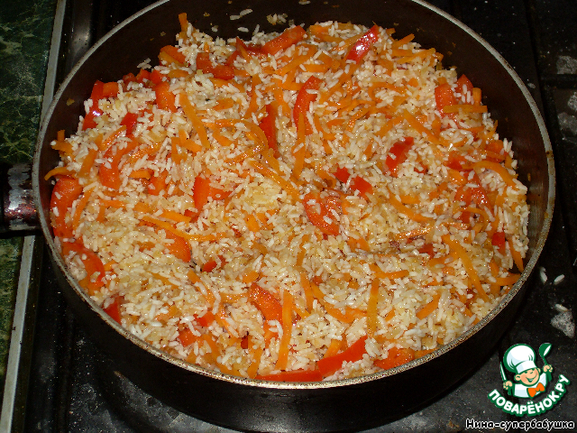 Довести до кипения, огонь убавить до самого маленького, накрыть крышкой и варить плов 10 минут.