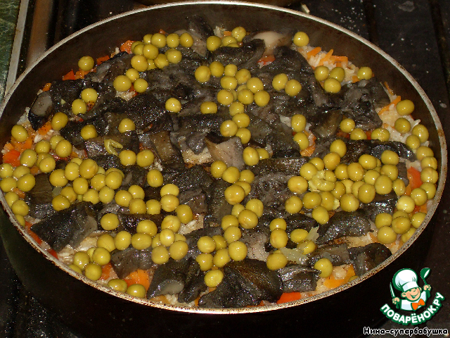 Затем добавить в сотейник горошек, накрыть крышкой и потомить еще 5 минут.