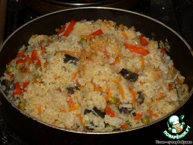 Снять крышку, сгрести плов в середину сотейника горкой, накрыть крышкой и дать ему настояться минут 10. По желанию можно добавить чеснок во время последней операции.
