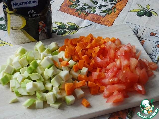 Вымытые и очищенные морковь и кабачок нарежьте кубиками. Помидоры надрежьте крест-накрест, подержите пару минут в кипятке, окуните в холодную воду, снимите шкурку и также нарежьте кубиками.