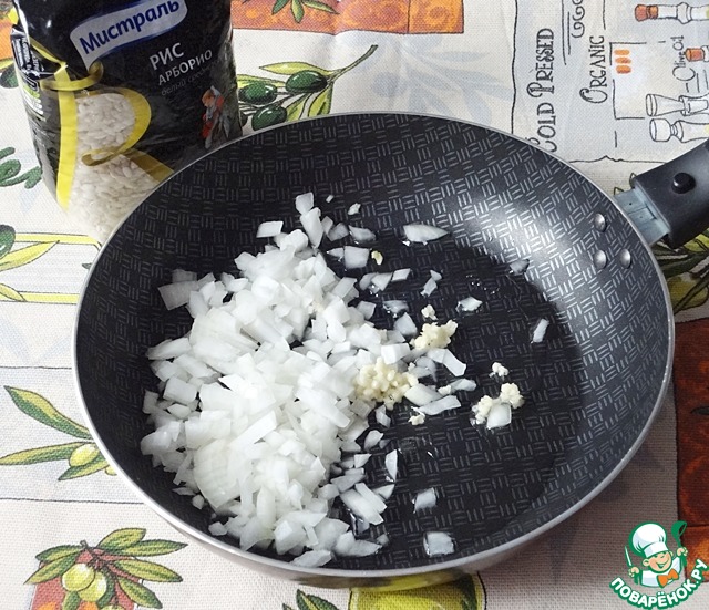 Разогрейте масло в глубокой сковороде. Вообще-то, паэлью следует готовить в паэльере (это огромная плоская толстостенная сковорода с двумя ручками), но сгодится и обычная сковорода. Положите лук и чеснок, слегка обжарьте в течение 2 минут до золотистого цвета.