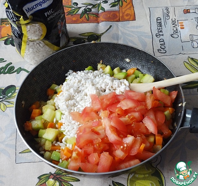 Промойте рис, положите его в сковороду, перемешайте. Я использую рис Арборио ТМ Мистраль. Этот рис - один из лучших сортов итальянского среднезерного риса. Он как нельзя лучше подходит для приготовления паэльи. Добавьте помидоры (можно использовать консервированные).