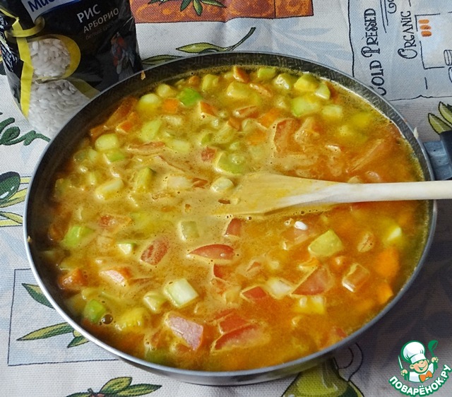 Всыпьте в бульон куркуму и паприку и влейте все в сковороду. Доведите до кипения, затем убавьте огонь и готовьте 20 минут, помешивая время от времени, пока рис не станет мягким.