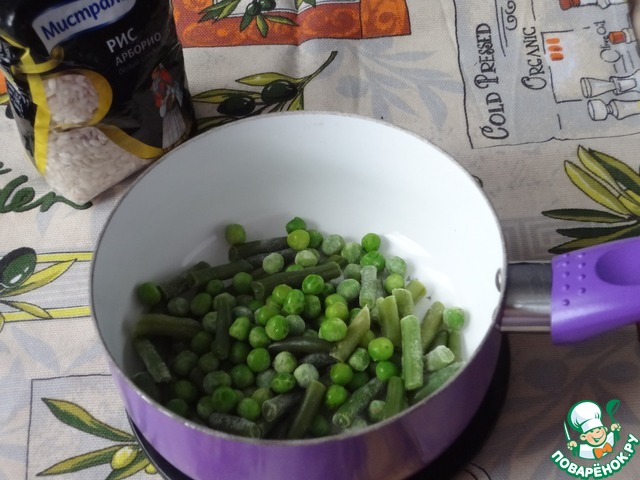 Одновременно отварите фасоль и горошек в кипящей воде минут 5. Слейте воду и добавьте к рису за 5 минут до окончания готовки.