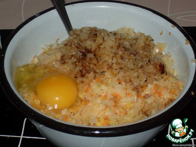 Добавить яйцо и лук, обжаренный или свежий, как вам больше нравится. Тщательно перемешать.