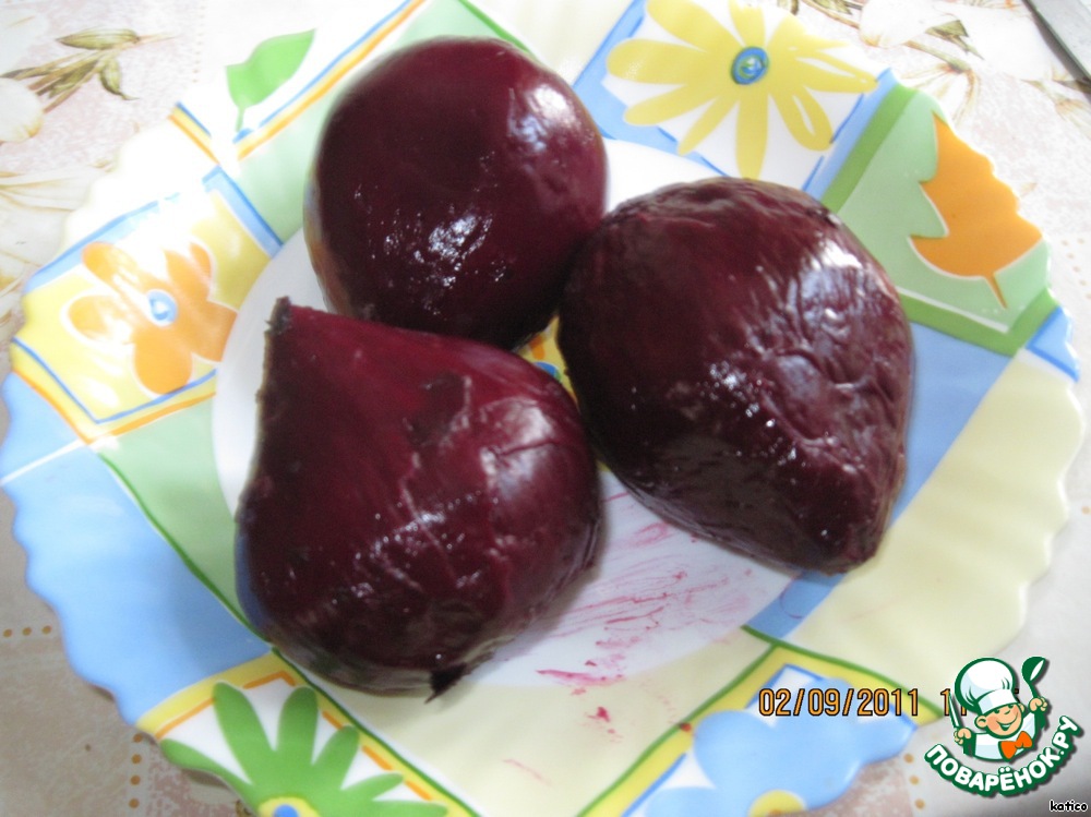 Разрезать свеклу пополам, аккуратно вырезать серединку и порезать ее мелким кубиком.