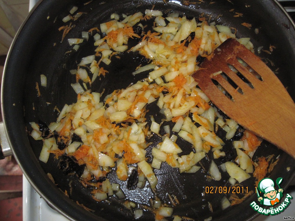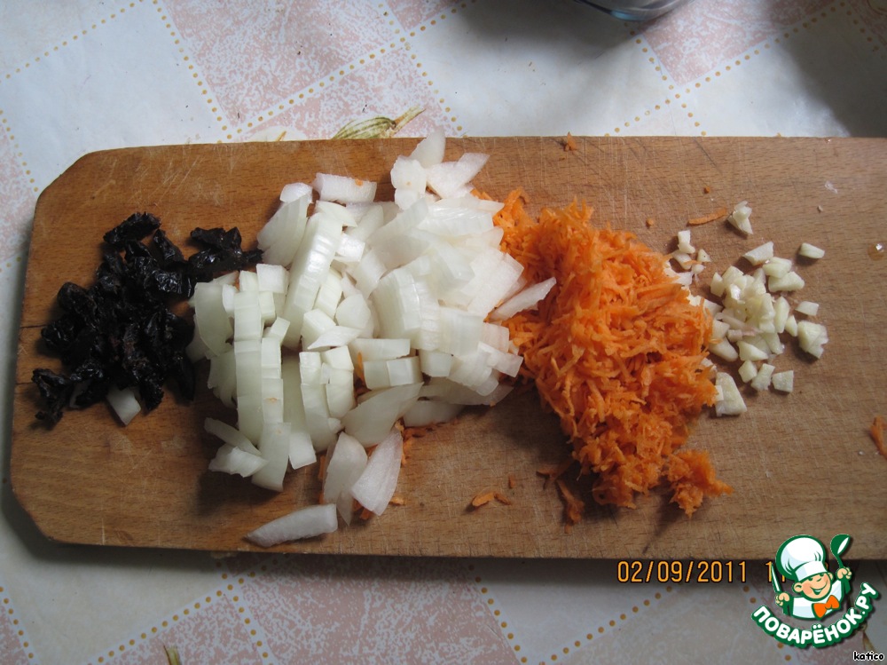 Мелко порезать чеснок, лук, потереть на мелкой терке морковь, порезать чернослив (запаривать его не надо).