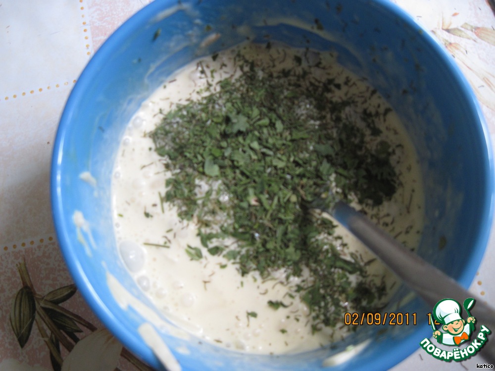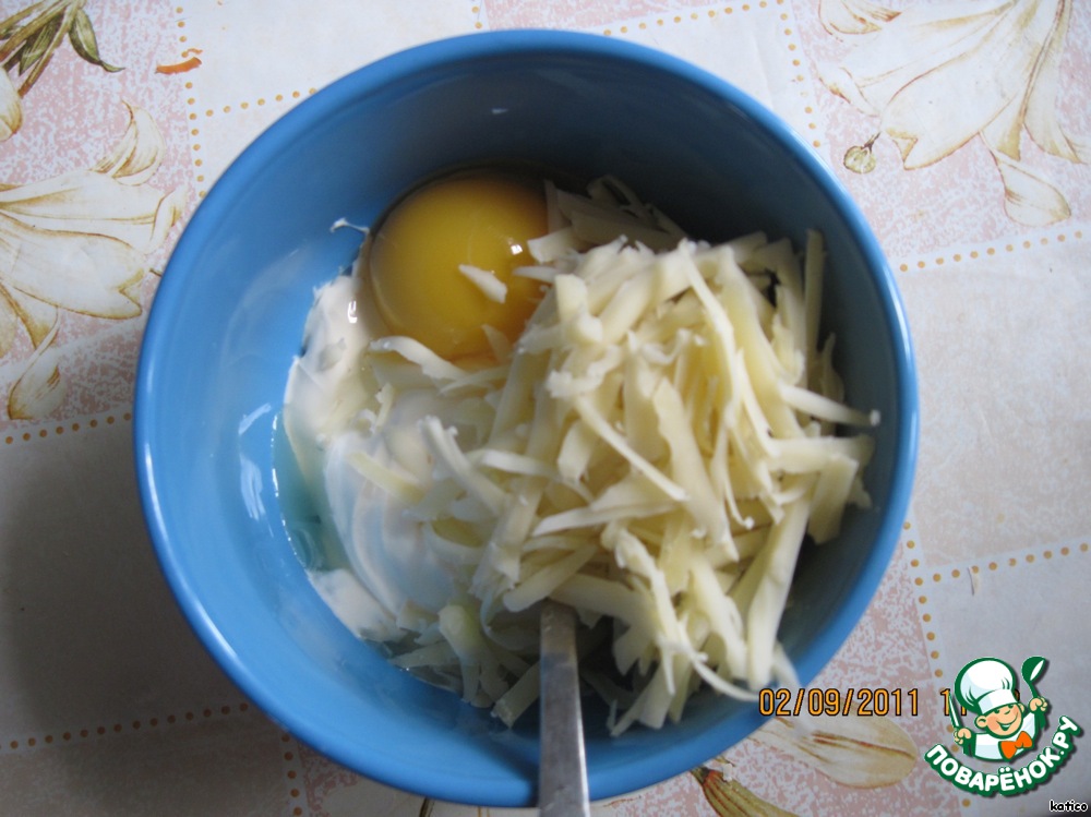 В отдельной посуде смешать яйцо, жирные сливки или сметану, тертый сыр,