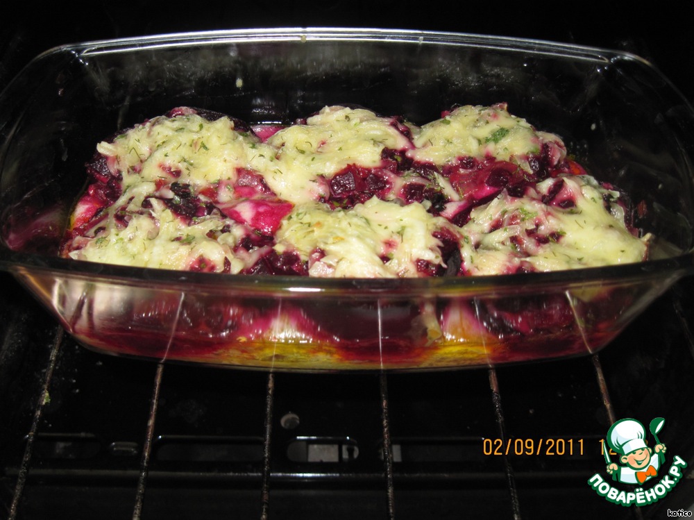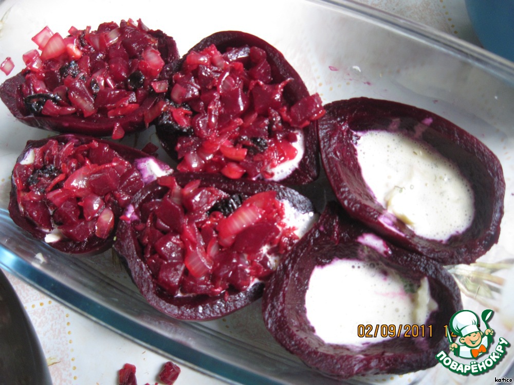 Половинки свеклы уложить в форму для запекания, в каждую положить по чайной ложке сливочной смеси, сверху уложить обжаренные овощи и слегка придавить их вилкой, затем опять сливки с сыром.
