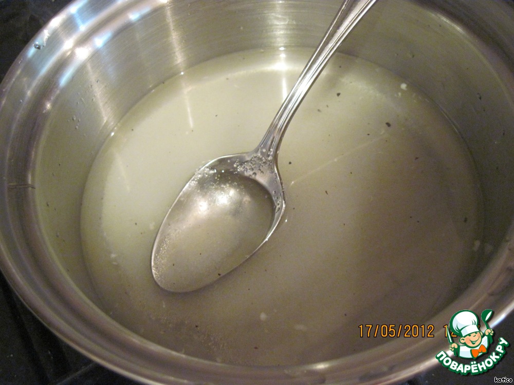 Жидкость от кокоса соединяем с сахаром и нагреваем. Если жидкости немного, добавляем водички.