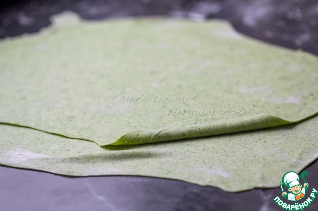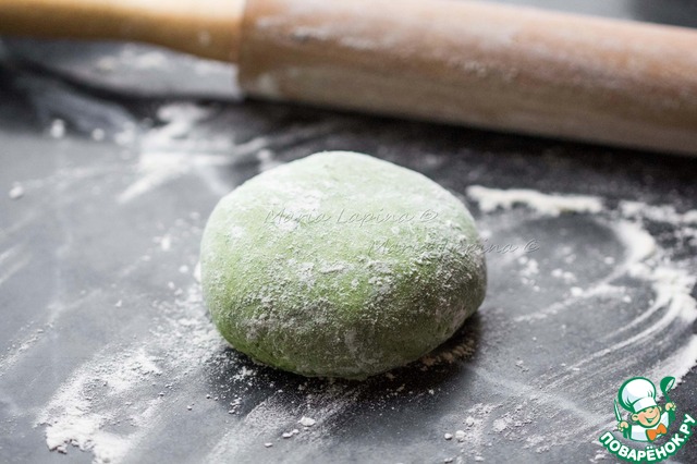 Для того, чтобы окрасить тесто в зеленый цвет, нужно сделать кашицу из шпината. Сначала его необходимо кинуть в кипящую воду и поварить 2 минуты, затем протереть через сито. Если останется жмых, его выкинуть, а кашицу оставляем для теста. Муку высыпаем горкой на чистую рабочую поверхность, просеяв её. Делаем небольшое углубление, кратер по центру. Вливаем туда часть воды, кладем кашицу из шпината и начинаем вилкой размешивать воду, собирая с краев муку. Постепенно добавляем всю воду и, когда тесто станет немного однородным, продолжаем замешивать его руками. Месим тесто до эластичности около 10 минут. Готовое тесто скатываем в шар, присыпаем мукой, накрываем пищевой пленкой и отправляем в прохладное место минимум на полчаса.