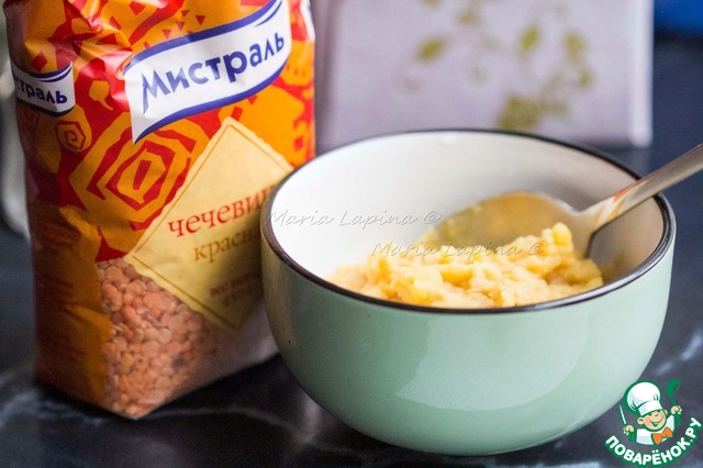 Отварить чечевицу до готовности, можно немного дольше, чтобы разварить.