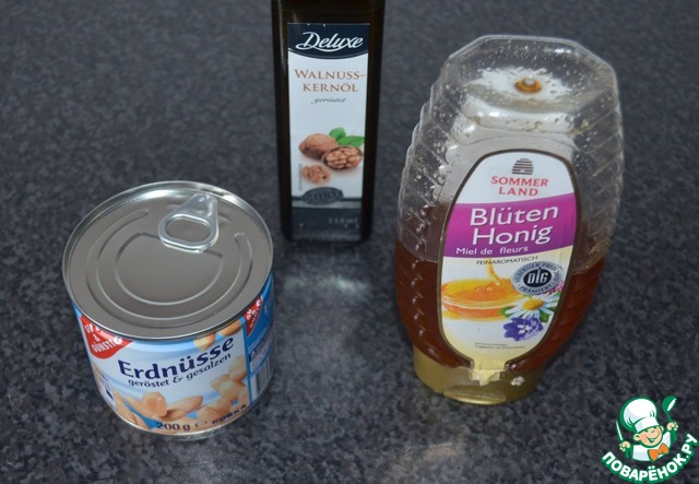 Уже готовые орехи, чуть больше половины и подсолнечное масло, перемолоть в блендере до однородной массы. Добавить оставшийся арахис и мёд и ещё немного перемолоть так, чтобы остались небольшие кусочки!