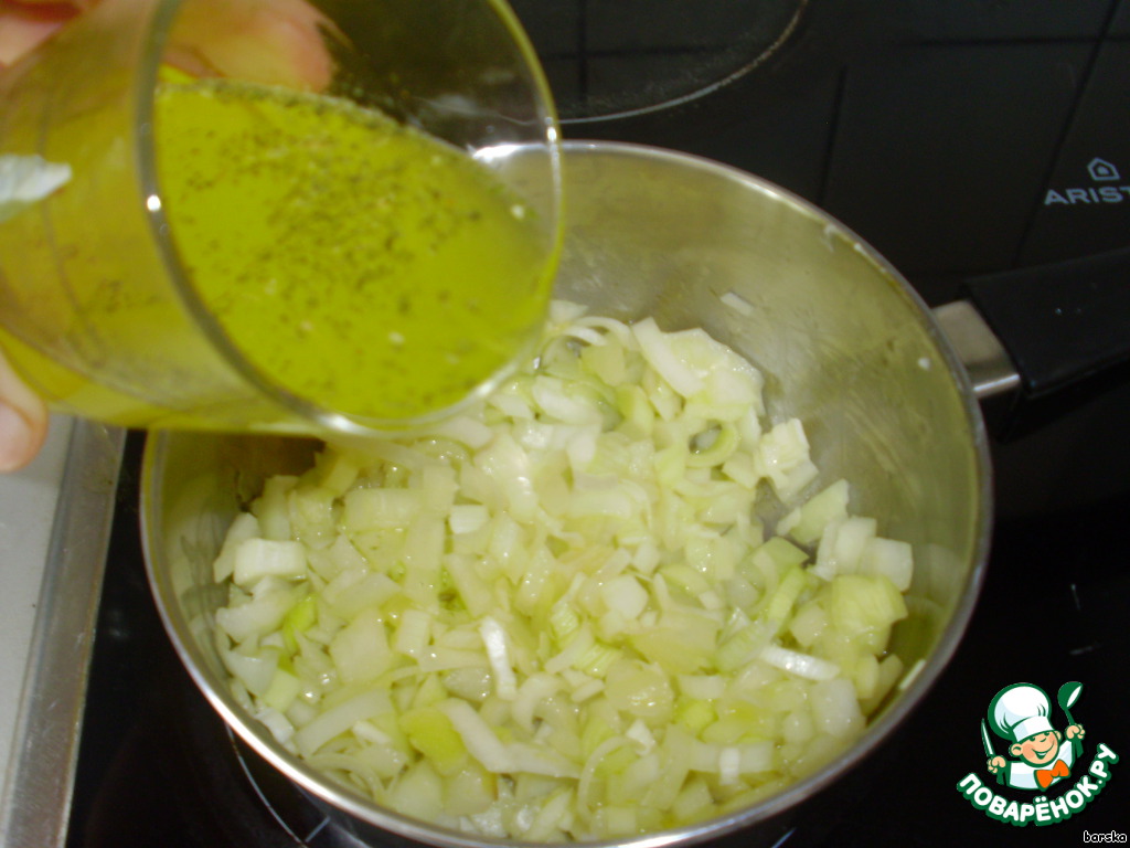 В кастрюльку со сливочным маслом добавить лук, поставить на медленный огонь. Когда лук немного протушится, добавить овощной бульон (у меня разведённый бульон - из приправы "10 овощей" от Торчин-продукт)Тушить 15 минут.