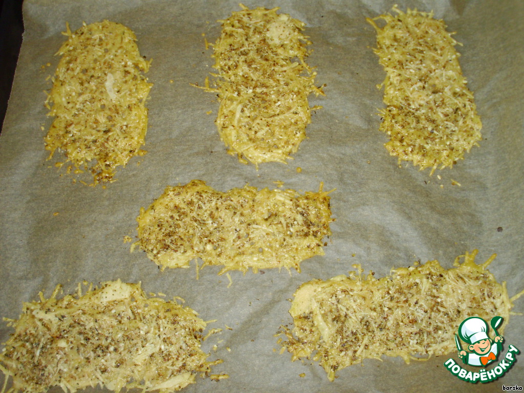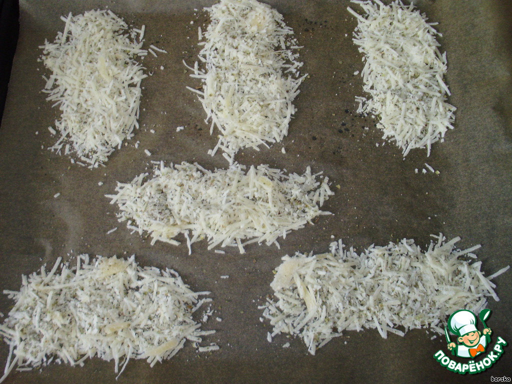 Выложить сырную массу в виде прямоугольников на бумагу для выпечки и отправить в ПРЕДВАРИТЕЛЬНО РАЗОГРЕТУЮ духовку с функцией "гриль" на 4-5 минут!