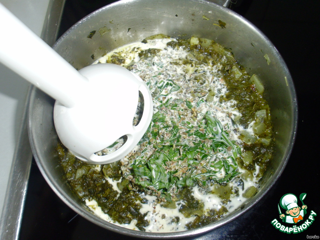 Охлаждённую шпинатно-луковую массу взбить миксером, добавив сливки и специи
