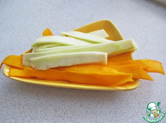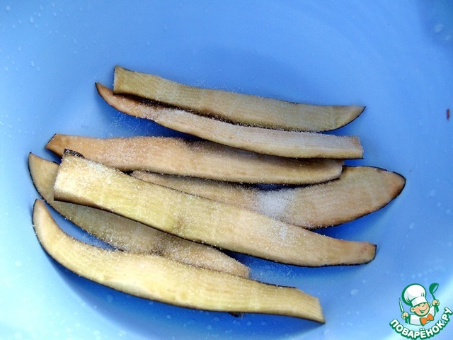 Баклажан нарезать полосками, посолить, оставить на 15 минут, затем промыть водой.