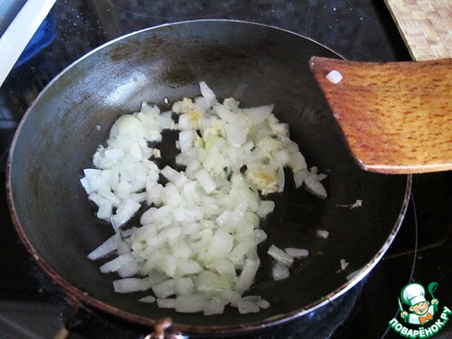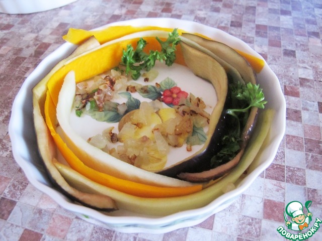 На дно формы кладем пассированный лук, нарезанную зелень и сверху кольца из овощей, пока форма не заполнится.